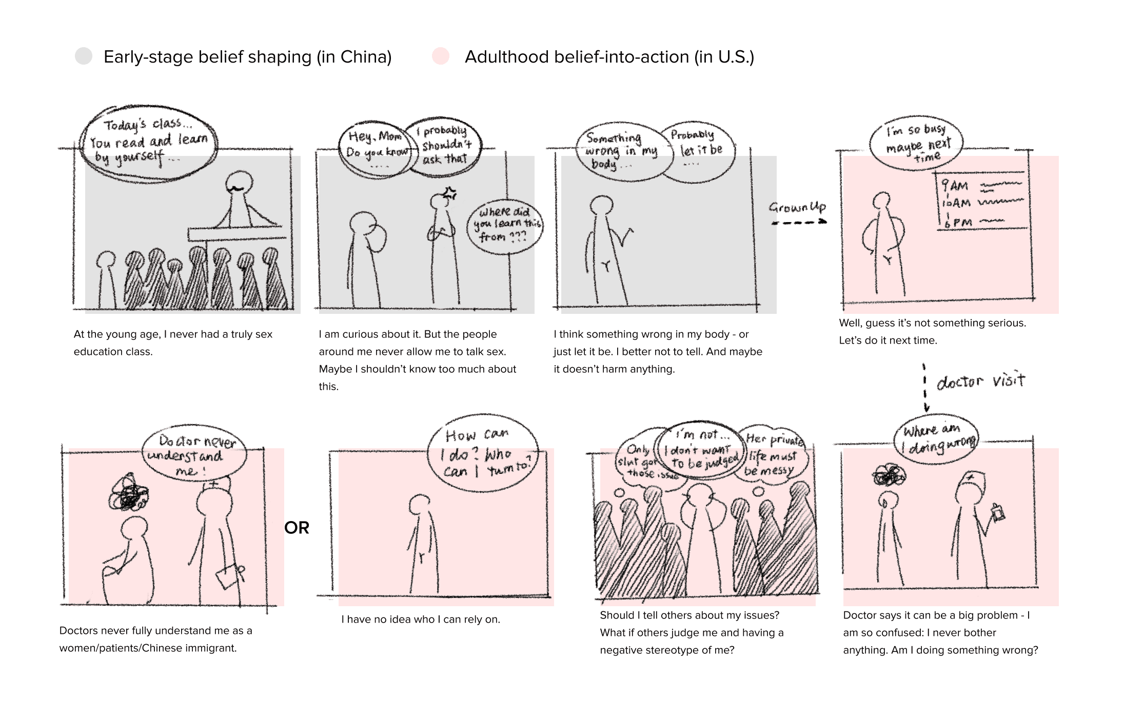 Inspired by their fascinating stories, I co-visualized with my participants in a storyboard on how early beliefs shaped and manifested into health decisions in the adulthood as a common patterns.
