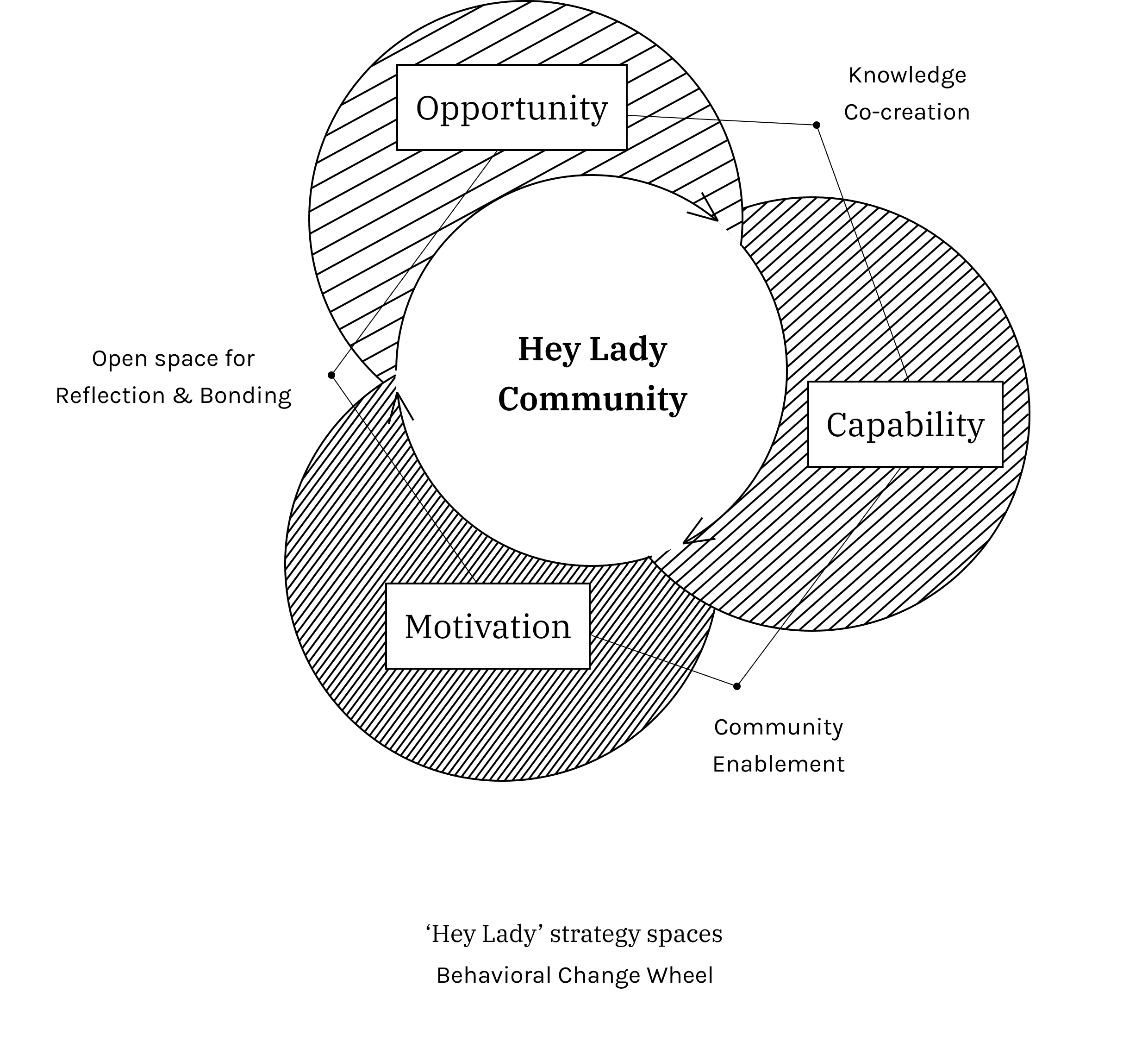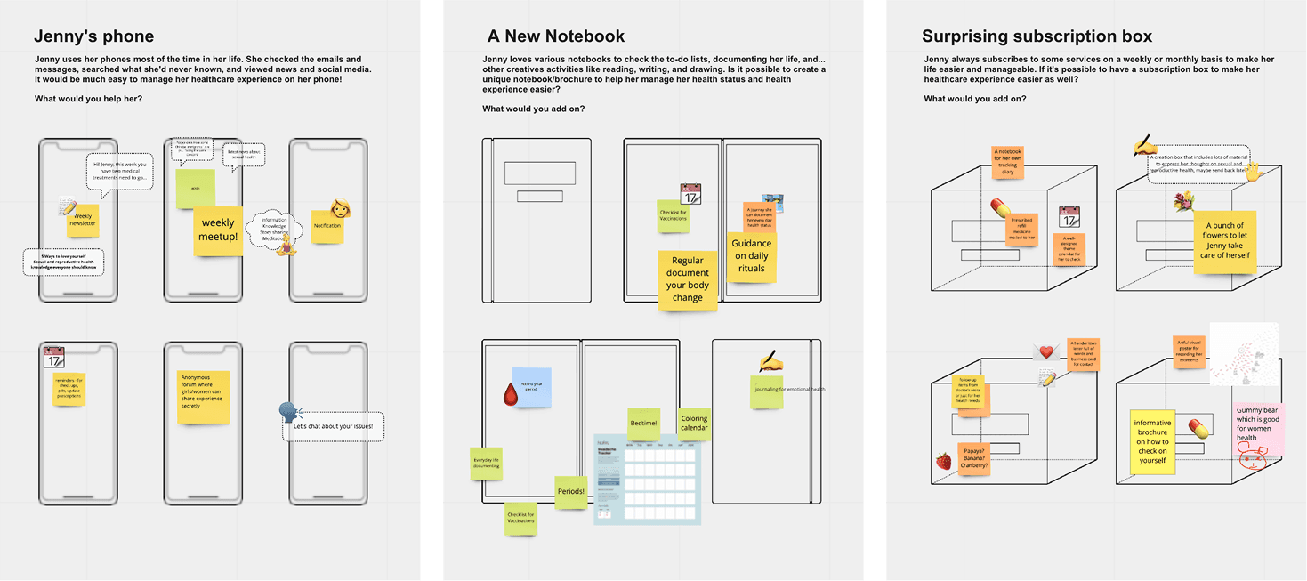 Not all of the ideas I’ve outlined above are equally feasible. Behavioral Change Wheel(BCW) and my research insights together identify the spaces where my project, HeyLady, eventually can intervene in the behavioral change. Some participants shared that the interviews and storyboard co-drawing themselves had helped them realize that some of their approaches to health issues could be improved. Thus, my final interventions leaned towards conversational and community-oriented approaches.