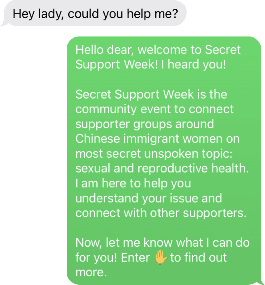 To further encourage community engagement, I hosted 'Secret Support Week' activities among the Chinese American community. Through matching support seekers with supporters during a week, I further connected more U.S.-based Chinese women to build a mutual support network.